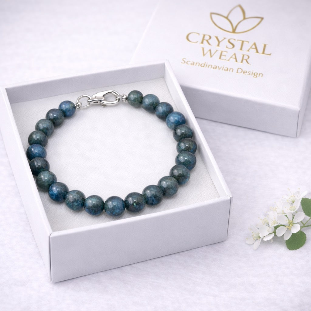 Apatit, känd som motivationens och manifestationens sten, har i århundraden burits för att stimulera kreativitet, öka fokus och stärka personlig vilja. Dess djupblå till turkosa nyanser arbetar subtilt med din energi för att klargöra mål, öka självförtroende och hjälpa dig att manifestera dina drömmar till verklighet. När du bär detta armband följer du en urgammal tradition av att använda naturens gåvor för personlig transformation.